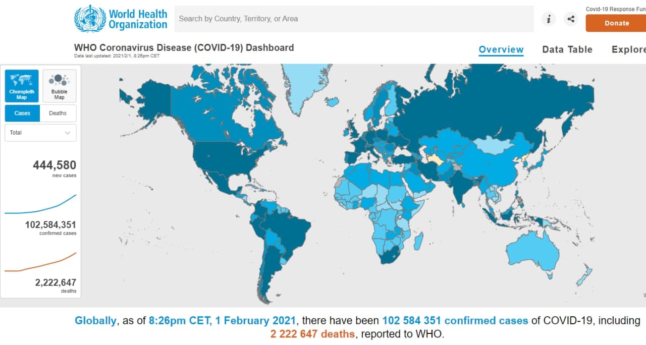 Jahon sogʻliqni saqlash tashkiloti maʼlumotlariga koʻra, dunyoda koronavirus infeksiyasini yuqtirganlar soni 102 million 584 mingdan ortiqni tashkil etmoqda, shundan 2...